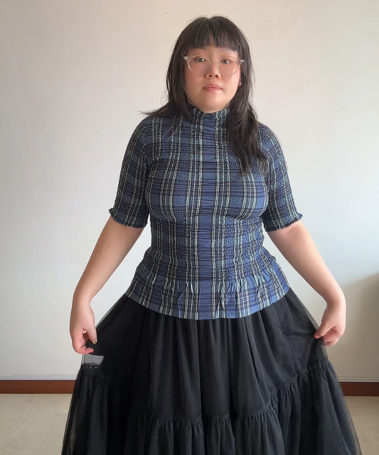 Yoshiki Hishinuma Blue Plaid Peplum Ruffle Hem Top