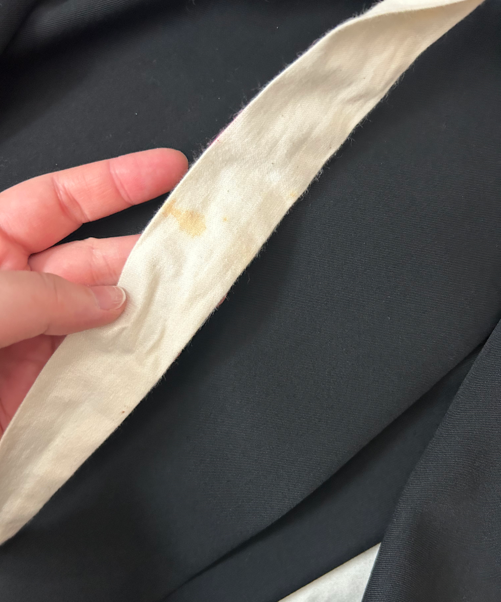 • Lightly worn. There is a small red mark and a light brown stain on the self-tying ribbon, but it is hidden when worn. Otherwise, the piece remains in great condition.