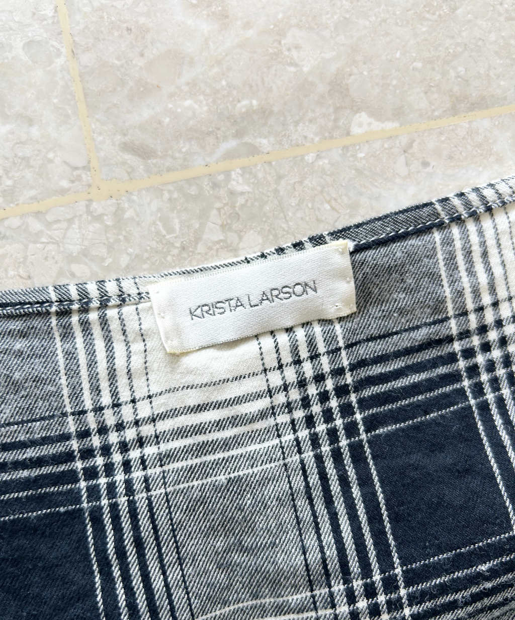 The Krista Larson Plaid Frill Camisole is a charming, feminine piece that blends classic and whimsical elements. Made with black and off-white plaid pattern, it has a timeless appeal while offering a modern twist. The standout feature is the wave-like frill detail, which adds a touch of playful elegance and softens the structured pattern. Its camisole silhouette makes it perfect for layering or wearing on its own, offering versatility for both casual and dressed-up occasions.
