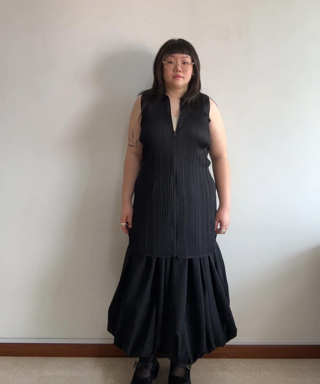 This Pleats Please sleeveless dress features the brand’s signature all-over pleats and a sharp collar, finished with a sporty double zip that lets you play with the styling. Lightweight, wrinkle-free, and easy to throw on, it’s the kind of piece that looks polished with zero effort.